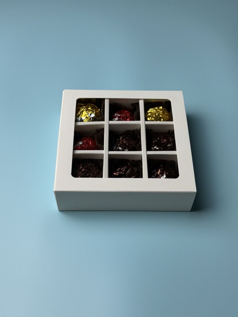 Набор из девяти трюфелей премиального качества. Конфеты изготовлены из высококачественного швейцарского шоколада, отборных орехов.